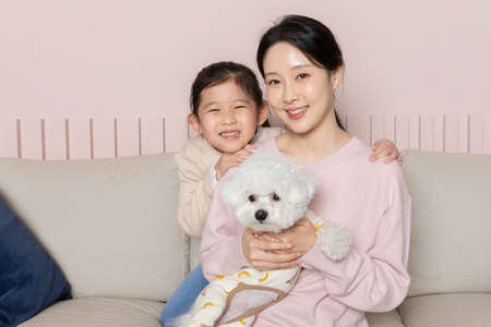 Asian Korean mother and daughter and puppy dog sitting on sofa