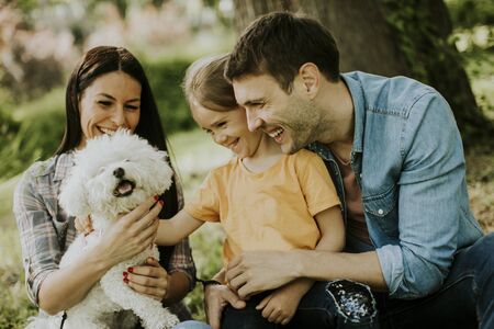 Happy young family with cute bichon dog in the park