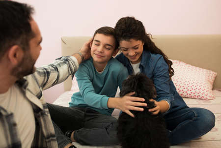 Family spending quality time together cuddling with their dog while sitting on the bed in bedroom.