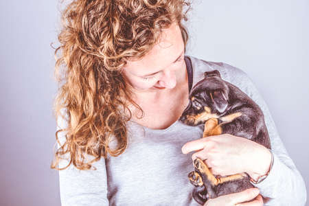 Part of a woman with brown curls, she lovingly cuddles a tiny Jack Russel Terrier puppy in her arms. In vintage, retro colors