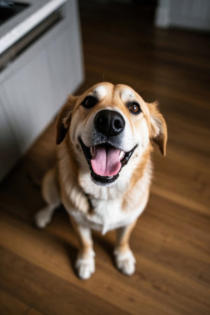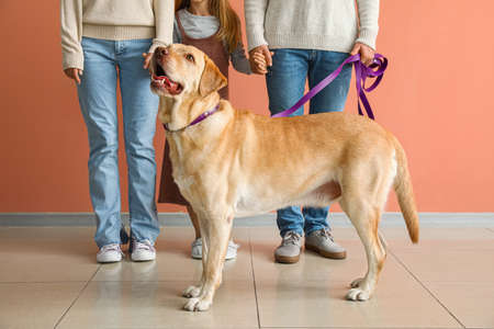 Funny Labrador dog with family near beige wall