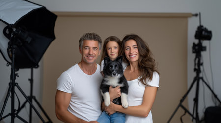Studio family portrait with parents child and dog in front of backdrop representing professional photography session and happy family memory for print services and advertising