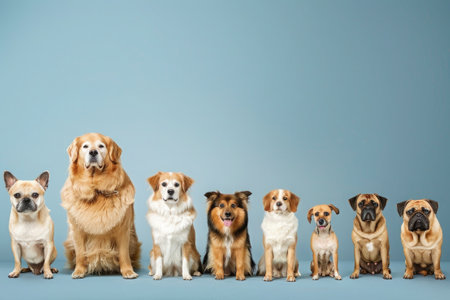 dogs sitting in a row on blue background