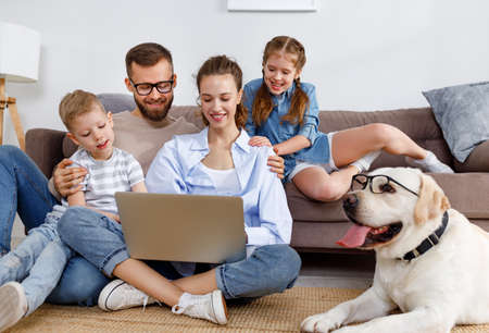 Cheerful family with little children and funny Labrador retriever dog in glasses gathering around laptop and watching interesting movie while spending free time together at home