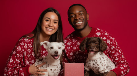 Family moment with two dogs in festive sweaters during a holiday celebration