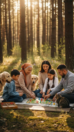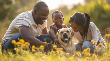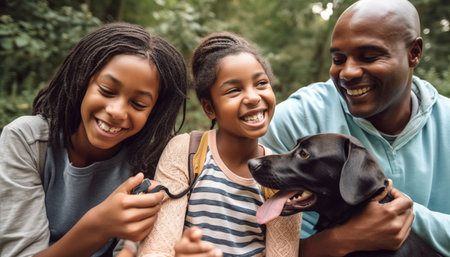 Family bonding with pets in nature embrace generated by artificial intelligence