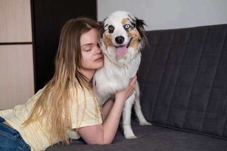 Dog and teen full of friendship kiss in the living room at home. The room of the living room in a modern styling. Purebred Border Collie dog in shades of white and black, and long and fine hair.