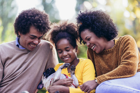 quality time of happy african american parents and son smiling and sitting on grass near dog