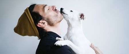happy people at home with favorite pet , love and friendship of human and animal pragma