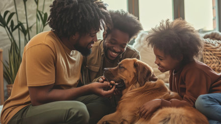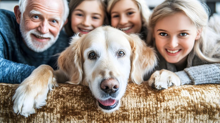 Happy family with their dog, smiling at the camera. Close-up view with warm lighting and soft textures. Ideal for family, pet, or happiness themes.