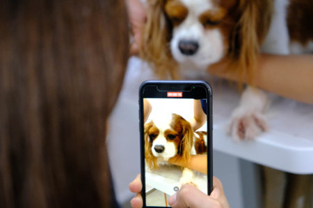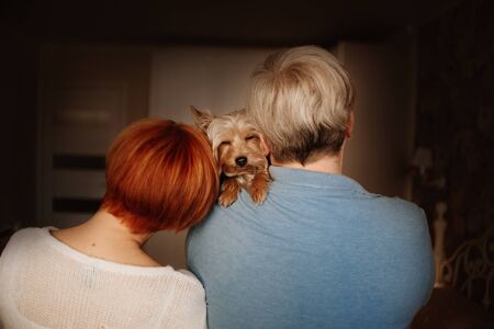 owners holding their yorkshire terrier dog indoors, rear view