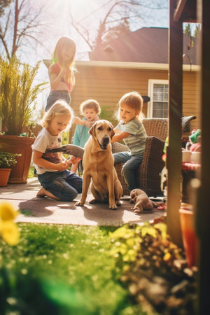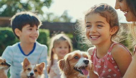 Group of cheerful children smiling and having fun with their cute dogs in the backyard, enjoying a sunny day together
