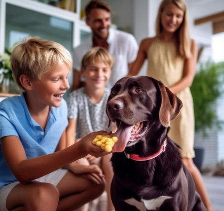 Generative AI : happy family parent with cheerful kids playing with their favorite pet dog labrador at home