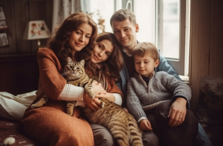 Generative AI : Happy family couple and a cat in Christmas at home