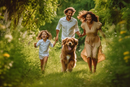 Spending time with family Happy young family of three with dog holding hands and smiling while running in park : Generative AI