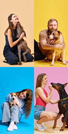 Collage Made of portrait of people with their dogs. Heartwarming interactions, showcasing joy and companionship that pets bring to our lives. Concept of pets lovers, emotions, friendship, animals. Ad