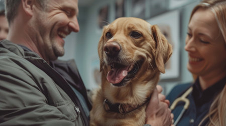 Smiling Veterinary Staff Celebrating Healthy Checkup with a Playful Golden Dog.