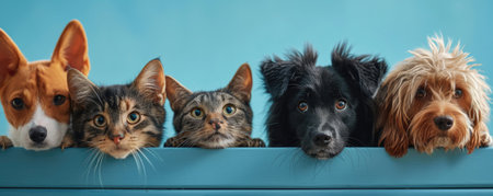 The picture of front view and close up of the multiple group of the various cat and dog in front of the bright blue background that look back to the camera with the curious and interest face. AIGX03.