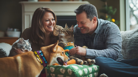 A joyful couple surrounded by their pets, sharing laughter and love in a cozy living room setting.