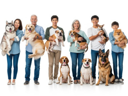 Full length portrait of a happy family with their dogs isolated on white background