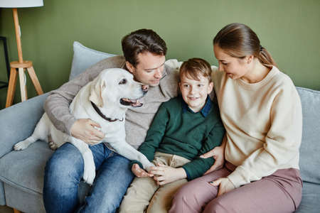 High angle portrait of happy family with dog sitting together on couch at home, copy space