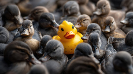 A bunch of ducks are gathered together, with one of them being a yellow rubber duck. The rubber duck is positioned in the middle of the group of ducks, making it stand out from the rest