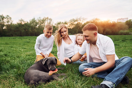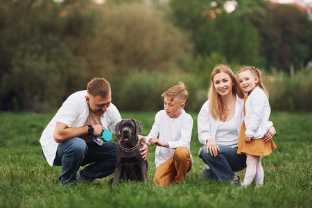Beautiful sunshine. Cute dog. Family have weekend outdoors at summertime together.