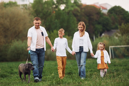 Walk with dog. Family have weekend outdoors at summertime together.