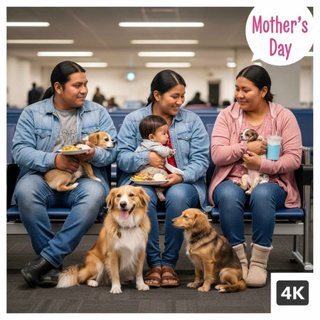 Happy family with their dogs at the airport. They are waiting for the flight.