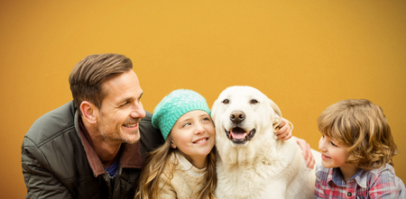 Happy family enjoying with dog in leaves against orange background