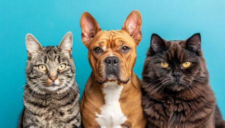Portrait of Serious Tabby Cat, Curious Dog with Brown and White Fur, and Fluffy Black Cat