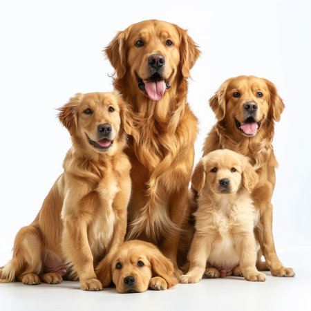 Group of golden retriever dogs isolated on white background. Studio shot.