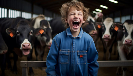 Little boy wearing blue overalls on farm with cows. Happy young farm boy in blue overalls on agriculture field Dutch landscape. Child having fun in stables