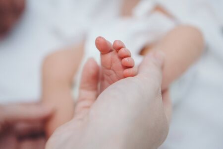 Mother uses her hand to hold her babys tiny hand to make him feeling her love, warm and secure.