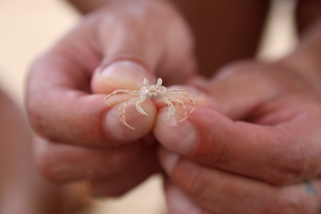 Adorable happy girl holding crab on the beach on spring day Focus on the crab