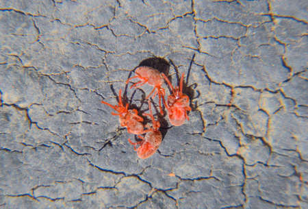 Mite crawls on yellow tweezers to remove ticks on a white background.