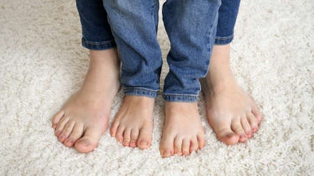 adult feet and cute baby feet. Feet barefoot. funny leg is big and small. fools day concept. Different foot size. Baby is sitting on the bed