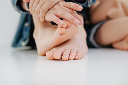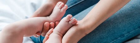 Close up top view of tender young mother hands carefully keeping baby foots with tenderness, loving mom holding tender baby legs lying on bed. Selective focus. ? oncept motherhood and baby skin care