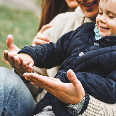 Male, female and child hand hold together on top of each other on white background. Family support for each other in difficult situation.