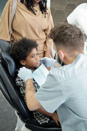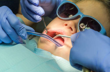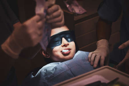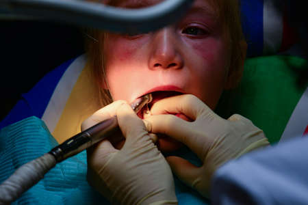 Closeup photo shoot of process of dental operation over small boy by expirienced dentist.