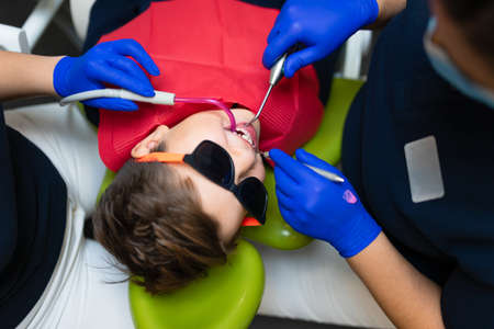 The boy is sitting in a dentist's chair, treating caries in a child, the dentist removes caries from the tooth with a drill, local light for a good tooth examination.