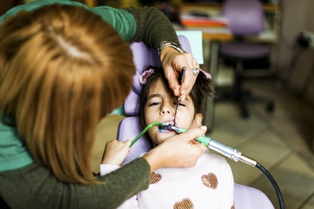 A little girl treats a tooth at a dentist, the doctor drills and cleans the tooth from the caries by polishing.