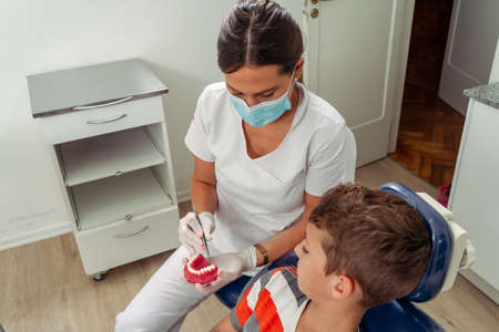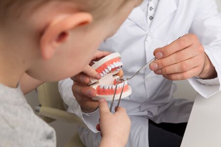 Using a dental model, the female dentist shows the child what treatment to perform. Concept dental care, health care.