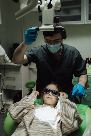 Small kid got a serious dental operation by expirienced dentist. Kid is wearing protective glasses.