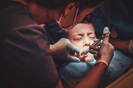 Little brave boy has a dental operation by dentist and her assistant at hospital.