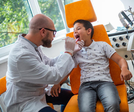 Oropharyngoscopy procedure for child. Otolaryngologist examines child throat with spatula. Family consultation with laryngologist