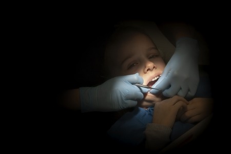 A beautiful little girl is repairing her teeth in a dental office on a dark background
