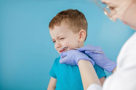 Small patient does not want to open the dentist's mouth on blue background. Dantist treats teeth. close up view of dentist treating teeth of little boy in dentist office