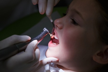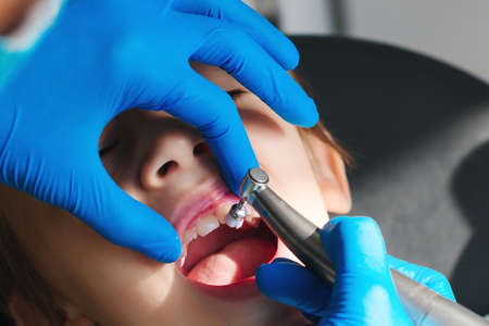 Dental drill close-up. Child dentist drilling teeth of kid girl in dentistry clinic. Teeth treatment. Dental filling for child patient