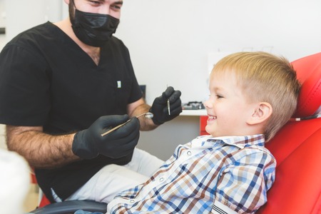 Boy patient visiting specialist in dental clinic. Dentist examining boy's teeth. Healthy teeth and childhood. Happy kid in clinic doing dental treatment. Dentist orthodontics.